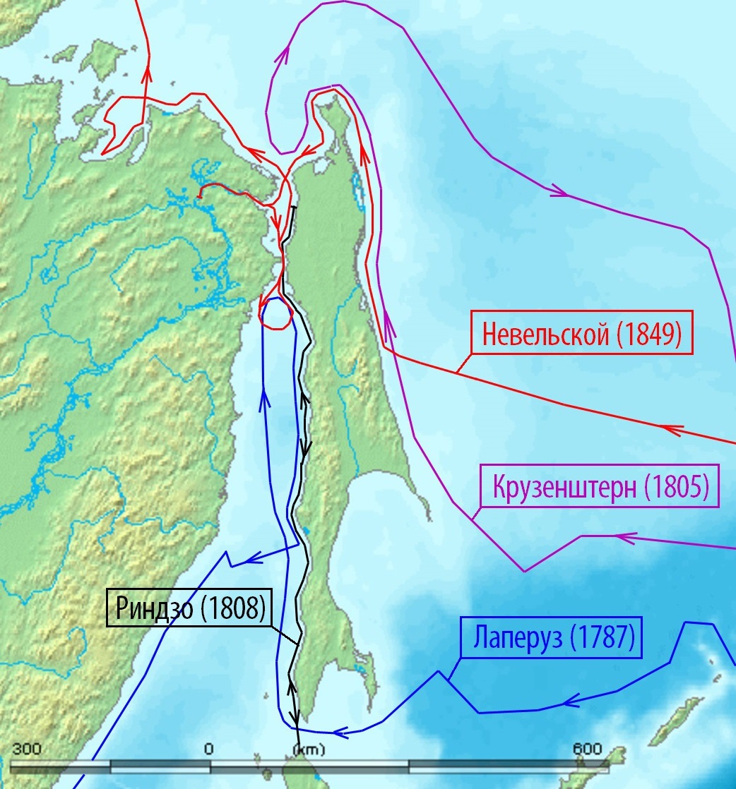 Невельской же, обогнувший Сахалин с Севера, из Амурского лимана вышел в Японское море через узкий пролив, который теперь назван его именем, достигнув как раз того места, в котором развернулся Лаперуз, то есть закольцевав маршрут Лаперуза. Так в одном плавании Невельскому удалось установить судоходность устья Амура и доказать, что Татарский залив это не залив, а пролив, и что Сахалин – это остров, а не полуостров. Это означало, что по Амуру можно было плавать на больших кораблях и выходить на юг, сразу в Японское море, не огибая Сахалин с севера.