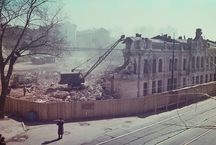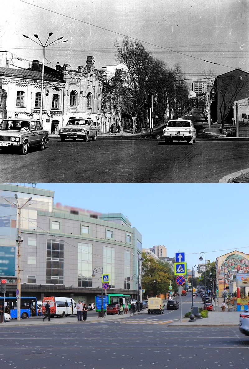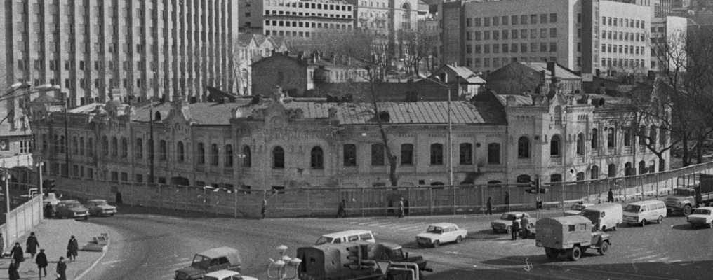 Редкий случай в наших рассказах о точках на карте Владивостока, когда старая фотография не такая уж и старая. На ней запечатлена последняя потеря старого, дореволюционного Владивостока, произошедшая сравнительно недавно – в 1987 году. Снимок сделан в 1982–84 годах, так что дому купцов Преваловых, изображенному слева, оставалось существовать всего три-четыре года.
