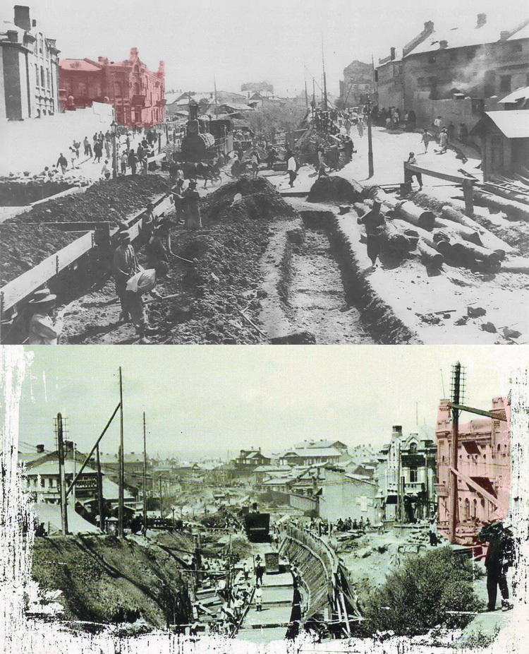 Здесь пришлось не только делать основательную выемку грунта, но и насыпать грунт по ее краям, приподняв уровень Семеновской площади, чтобы под ней проходили поезда, а заодно поднять уровень улиц – Семеновской и особенно Алеутской. Этот поперечный «горб», через который переваливают автомобили, хорошо заметен на снимках в начале статьи. Причем виадук на Семеновской площади получился с 10-кратным запасом прочности – инженеры явно смотрели в будущее. Впервые для строительства на Дальнем востоке был применен железобетон. А плиты для перекрытий из него изготовили по заказу и под контролем известного во Владивостоке строительного подрядчика Михаила Ивановича Суворова, городского патриота и человека выдающегося, имя которого мы будем не раз упоминать в наших рассказах.