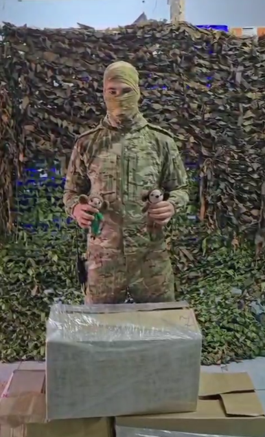 «Медицинская рота морской пехоты благодарит ТОС “Мусорского” за предоставленную гуманитарную помощь. С этой помощью мы сможем выполнять поставленные задачи. Победа будет за нами!» – говорит боец в маске и с двумя чебурашками в руках.