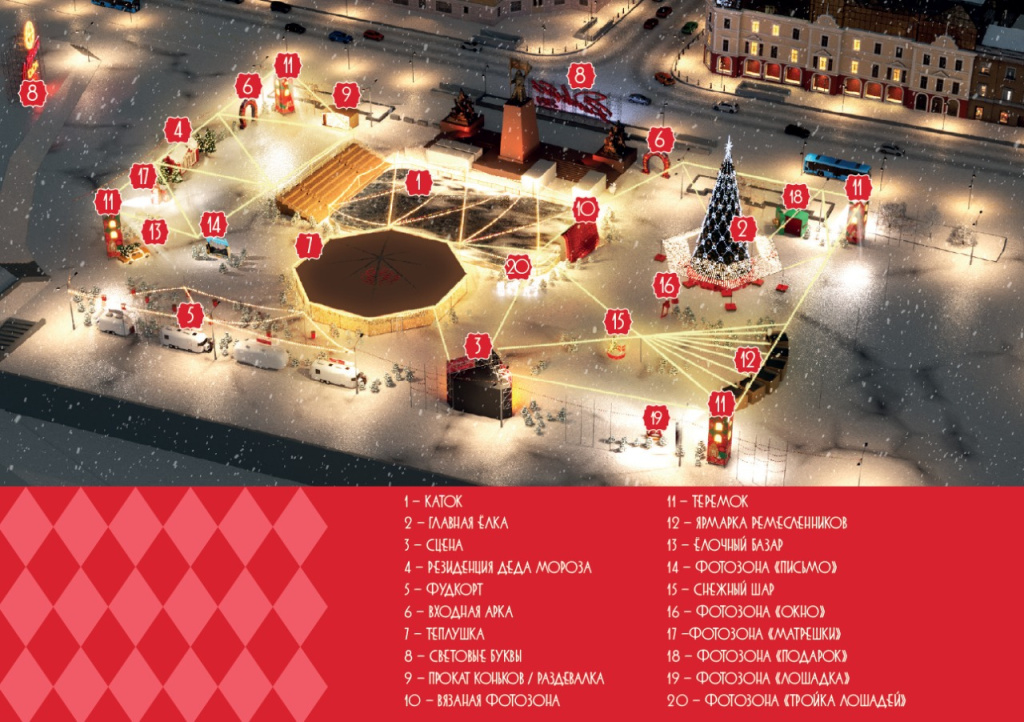 Частью визуальной концепции праздника станет символ года по восточному календарю – Красный Конь. На площади установят фотозоны «Лошадка», «Тройка лошадей», «Матрешки», «Подарок», «Письмо», «Окно», а также вязаную фотозону – символ тепла и уюта.
