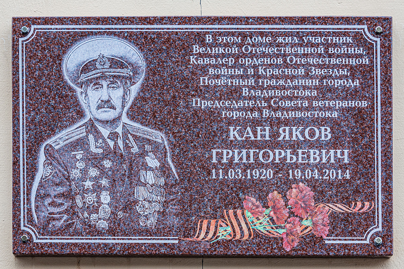 Во Владивостоке состоялась церемония открытия мемориальной доски ветерану Великой Отечественной войны, Почётному гражданину города Якову Григорьевичу Кану. Памятный знак установлен на фасаде дома № 52 на улице Пушкинской, где он проживал. Яков Кан ушёл из жизни в апреле 2014 года, не дожив нескольких месяцев до 95-летия.