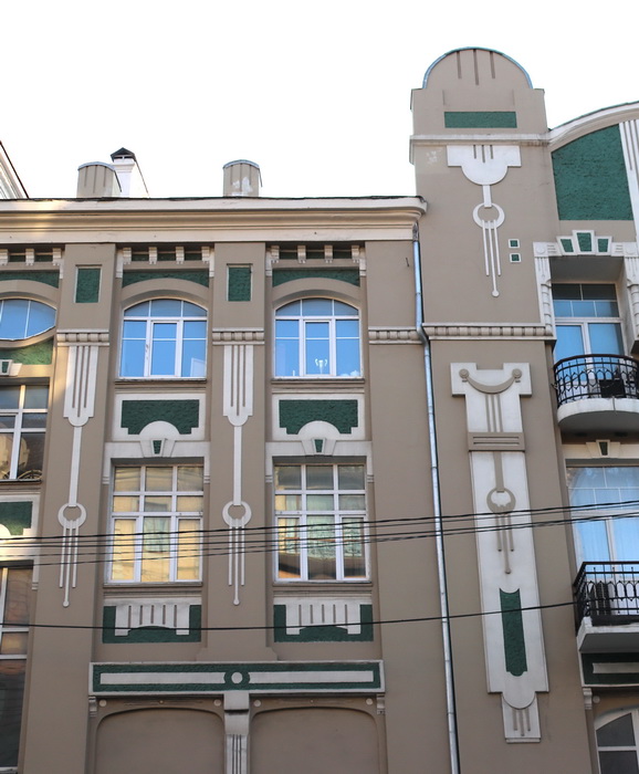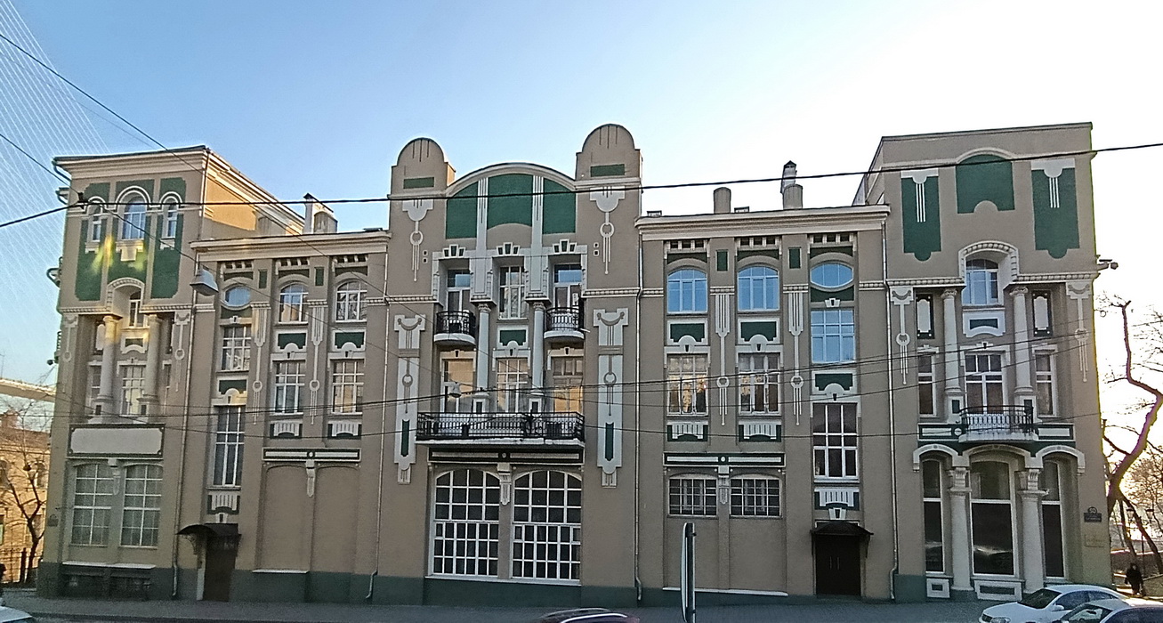 Петербургский, а значит, и владивостокский модерн был во многом навеян творчеством австрийского архитектора Отто Вагнера. Так, например, фасады дома буквально насыщены вертикальными бороздками-каннелюрами разной длины, параллельными линиями, выпадающими из колец – авторскими элементами Вагнера.