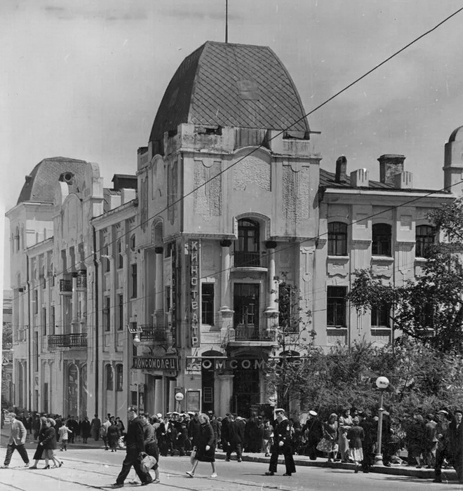 Первым на очереди в зрительском раю, изображённом на фото, был детский сеанс в кинотеатре «Комсомолец», который как раз находился в симпатичном здании на переднем плане.