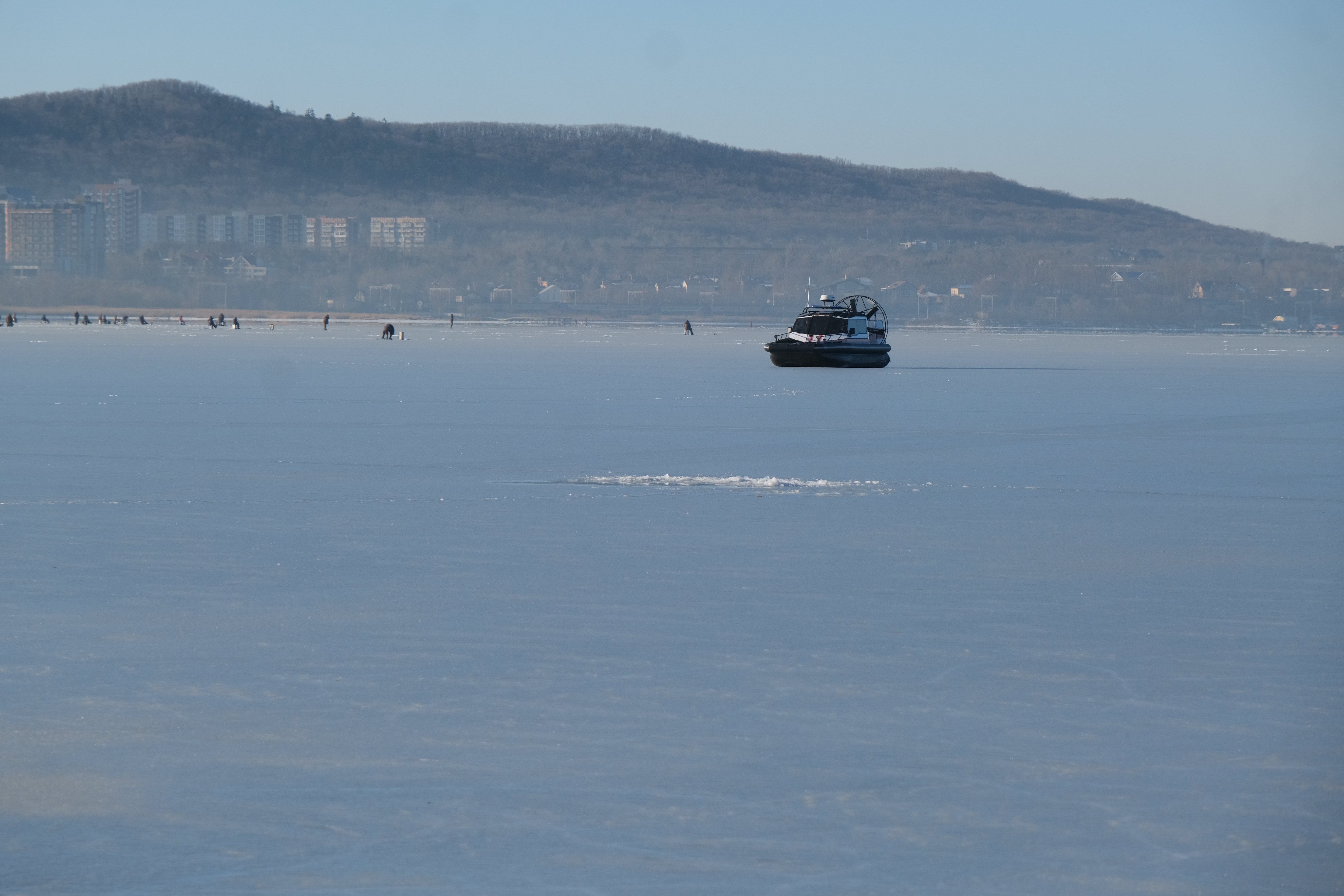 Уверенно скользя на воздушной подушке, судно двигалось вдоль берега, а через мощный громкоговоритель, раздавались четкие и настойчивые предупреждения о запрете выхода на лед, адресованные рыбакам-любителям. За управление судном отвечал капитан и замначальника поисково-спасательного отряда МКУ «ВГПСС» Леонид Маковецкий.