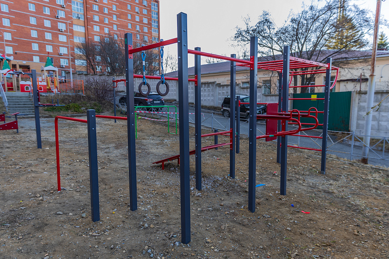 На Океанском проспекте, 140 теперь есть универсальное пространство для всей семьи. Объединившись в ТОС, жители не только разработали проект благоустройства, но и успешно выиграли грант правительства Приморья. На реализованной площадке удалось совместить игровые малые архитектурные формы для детей и уличные тренажеры для спортивных занятий.