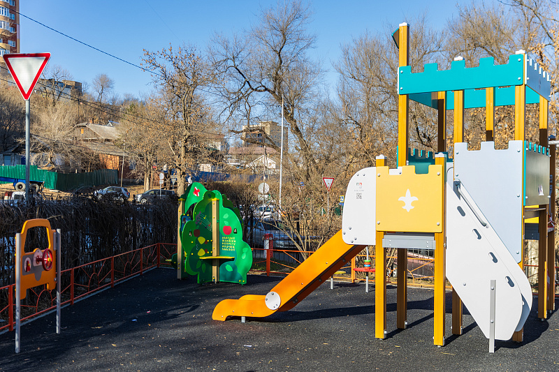 На улице Можайской у домов № 20, 22, 24 также появилась современная игровая зона – результат работы местного ТОС. А на Русской, 57ц активные соседи кардинально изменили пространство. Вместо старых полуразрушенных горок на краевой грант они создали безопасную площадку для дошкольников с ограждением, новыми игровыми комплексами и удобной лавочкой для родителей.