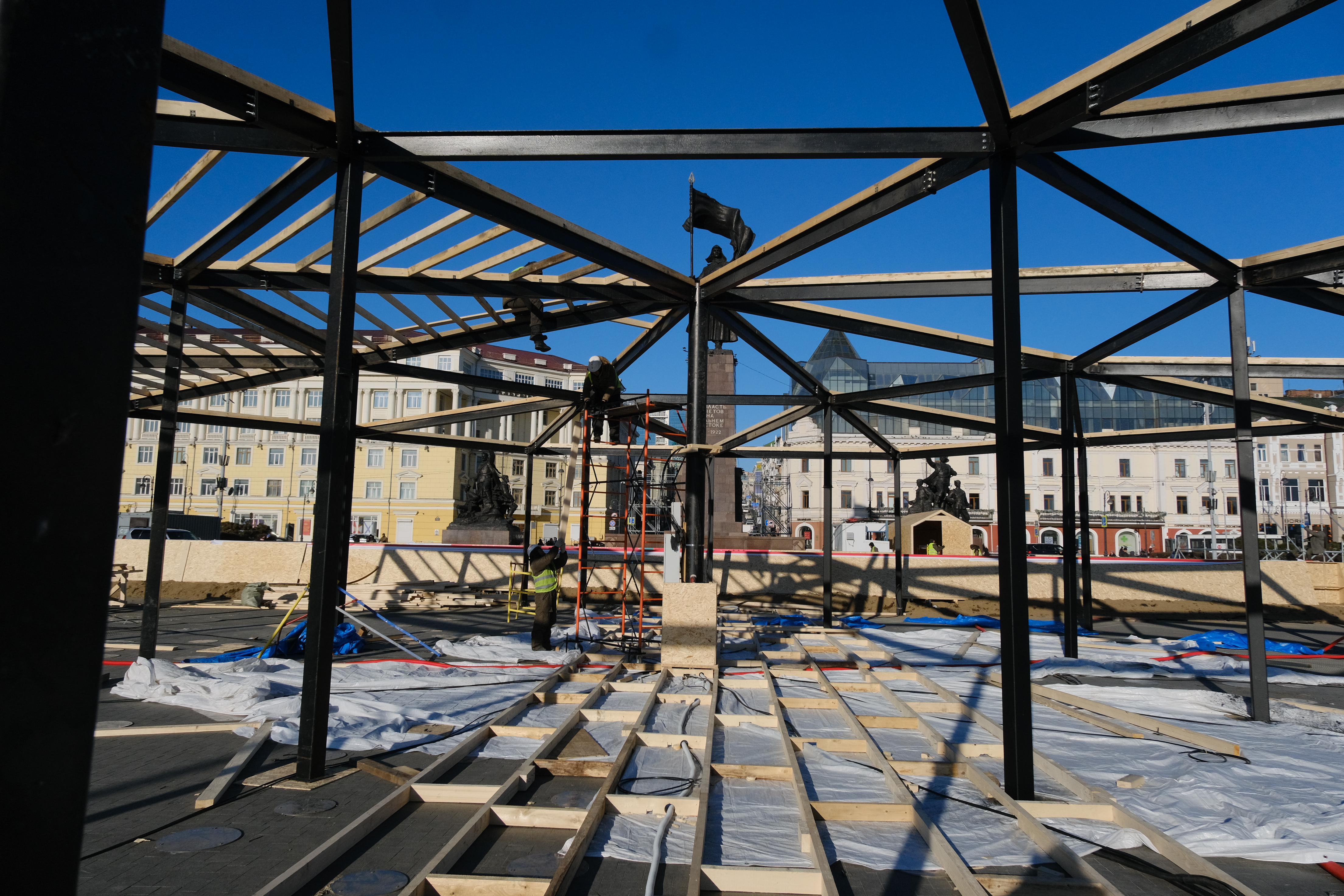 Пока весь город по вечерам начинал светиться гирляндами, главная площадь больше походила не на праздничную, а на большую стройку. Рабочие собирали каркасы будущих павильонов и объектов, а вместо музыки стоял шум строительных инструментов. Вместе с нашей съемочной группой мы прибыли как раз в самый разгар работ.